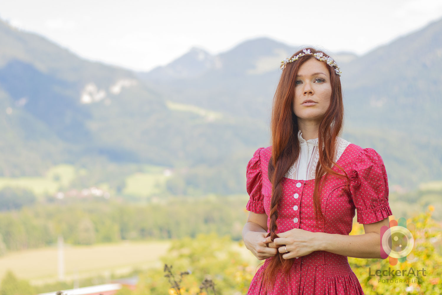 Stellt euch vor, Heidi kehrt als Erwachsene zurück in die Berge, um zu sehen, ob der Almöhi noch immer in seiner Hütte lebt. So eine Geschichte hatten wir zwar nicht im Sinn, als wir unser erstes Shooting mit Mia geplant haben, aber im Nachhinein passt das Bild perfekt! In ihrem roten Dirndl wirkt Mia, als wäre sie ein natürlicher Teil der bayerischen Bergwelt – wildromantisch und frei, fast als hätte sie hier immer hingehört. Man könnte sie sich leicht vorstellen, wie sie fröhlich singend durch die Wiesen tanzt, dabei vielleicht ein wenig mehr Haut zeigt, als Heidi es je getan…