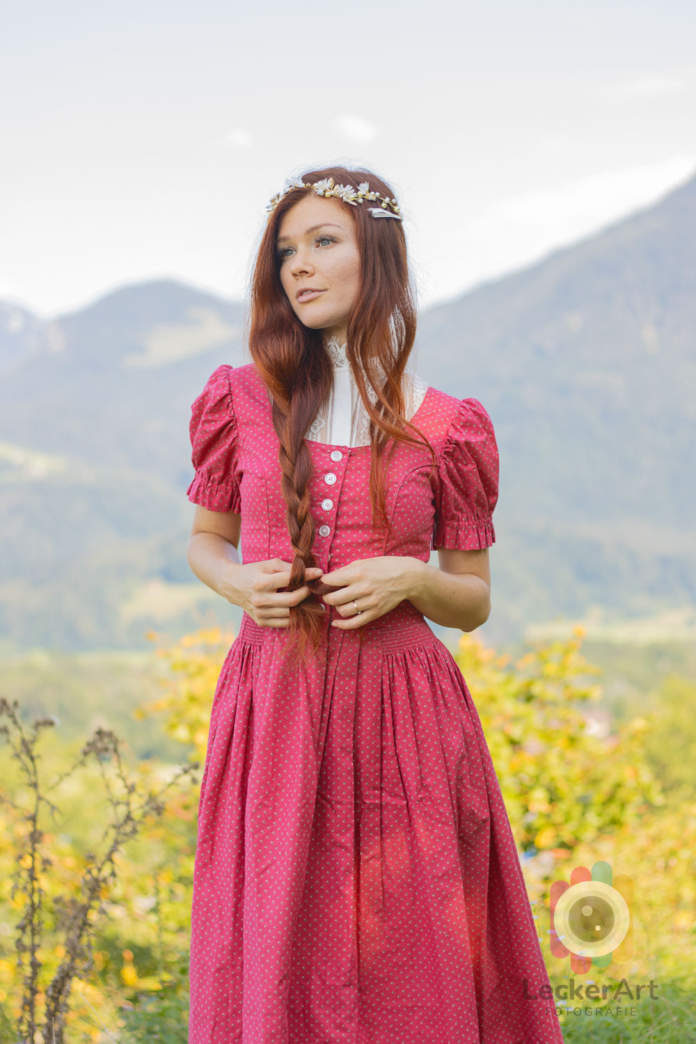 Stellt euch vor, Heidi kehrt als Erwachsene zurück in die Berge, um zu sehen, ob der Almöhi noch immer in seiner Hütte lebt. So eine Geschichte hatten wir zwar nicht im Sinn, als wir unser erstes Shooting mit Mia geplant haben, aber im Nachhinein passt das Bild perfekt! In ihrem roten Dirndl wirkt Mia, als wäre sie ein natürlicher Teil der bayerischen Bergwelt – wildromantisch und frei, fast als hätte sie hier immer hingehört. Man könnte sie sich leicht vorstellen, wie sie fröhlich singend durch die Wiesen tanzt, dabei vielleicht ein wenig mehr Haut zeigt, als Heidi es je getan…